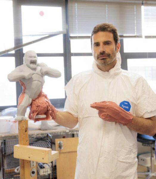 Fidèle à son image, l’artiste est représenté un Wild Kong rouge à la main. Ce choix scénographique scelle l’union indéfectible entre le créateur et son bestiaire facetté. Fruit de six mois de travail minutieux dans les ateliers du musée, ce double de cire capture l’énergie d’un parcours qui a su s’imposer dans l’imaginaire collectif.